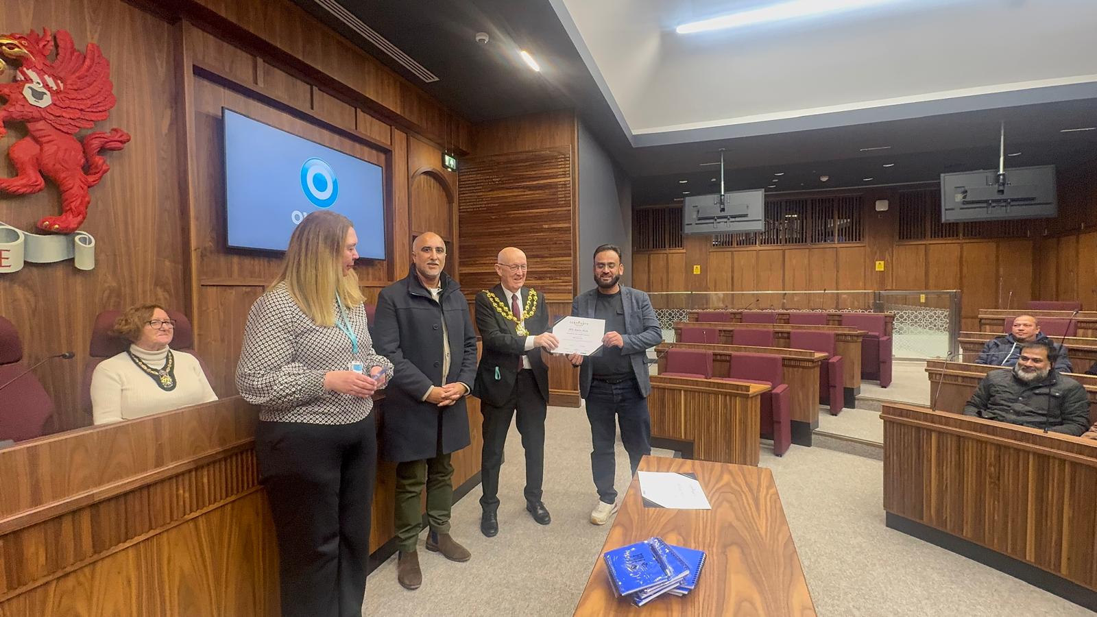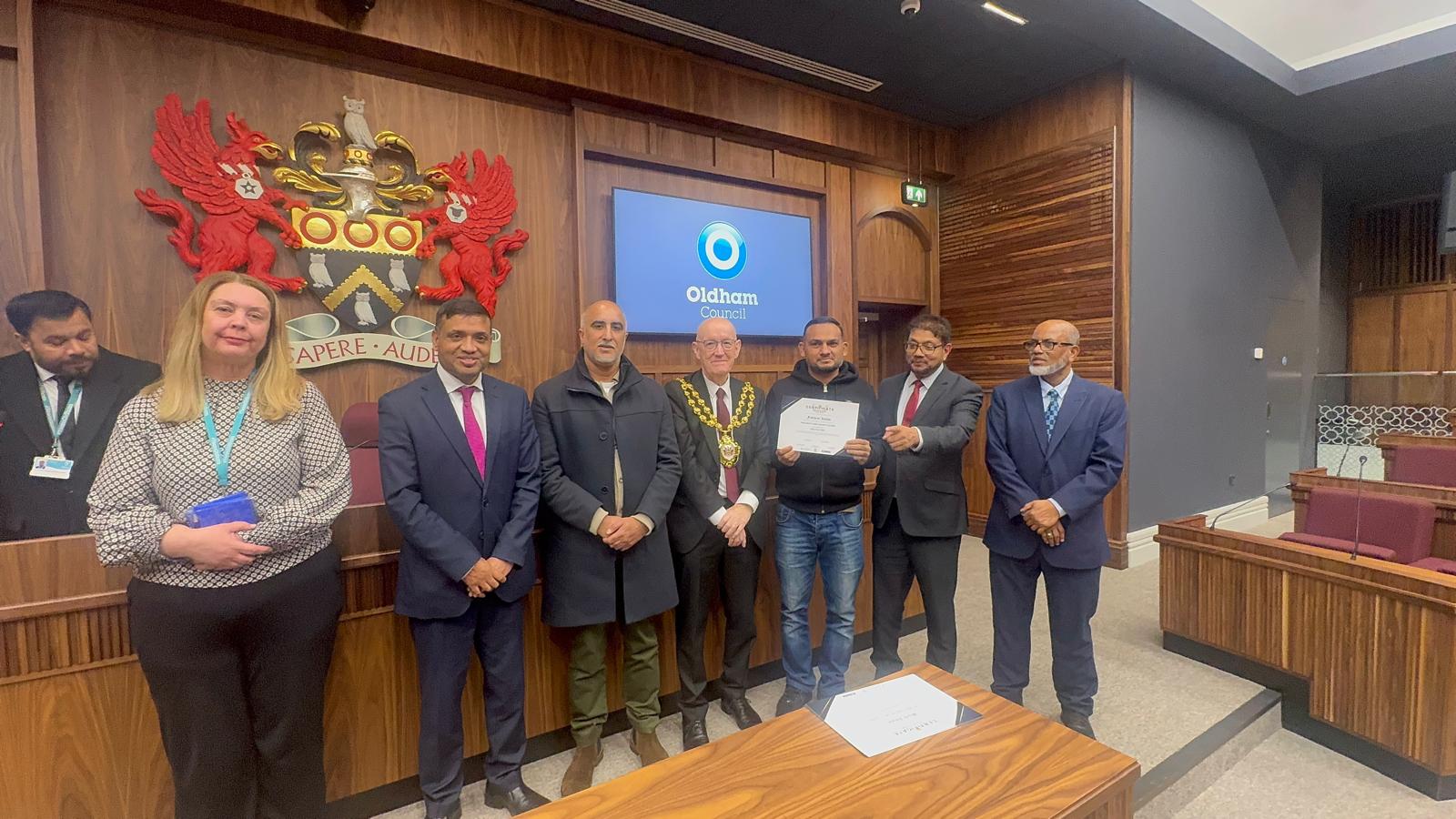On 17 November 2025, members of Oldham Dual Drivers Unity (ODDU) attended a special certificate award ceremony at the Oldham Council Chamber to mark the successful completion of the Taxi Safety & Security Course. This course was organised by ODDU Training Officer, Surat Ali (Badsha), in conjunction with the Chadderton Central Councillors, as part of ODDU’s ongoing commitment to improving safety, professionalism, and standards within the taxi trade.